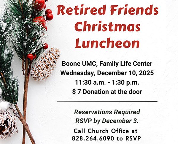 Retired Friends, a ministry of Boone UMC, brings together men and women of retirement age for Food, Fellowship, and Fun on a quarterly basis. Watch for updates, plan to join us, invite a friend, and help spread the word for our lunches each winter, spring, summer, and fall! Call the Church Office at 828-264-6090, and we will get you in touch with our Retired Friends leadership for more information.
